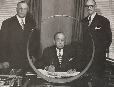 Burt E. Hull, President of the TAPline Company (center), Clyde A. Swigart, a vice-president of the TAPline Company (left), and A. N. Horne, another vice-president of the TAPline Company (right), pictured with a piece of the pipe used for the project.